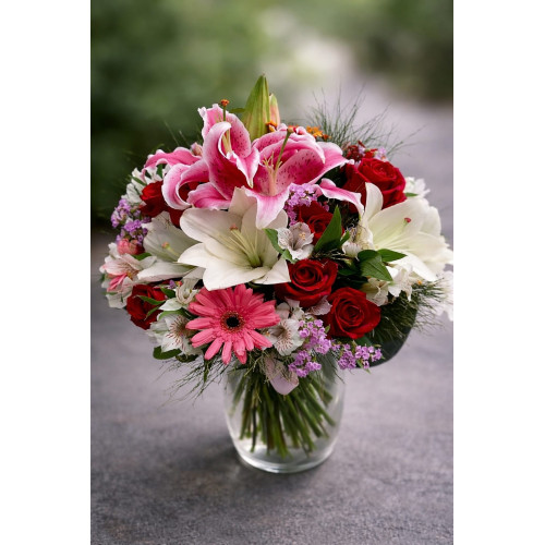 • What a gorgeous arrangement! This collection of mixed pink lilies, pink and white gerberas, red roses, colored daisies and foliage in a glass vase is ideal to present someone with on any date!  Wrapped in a sophisticated way with a touch of kind, this gift will delight for sure.